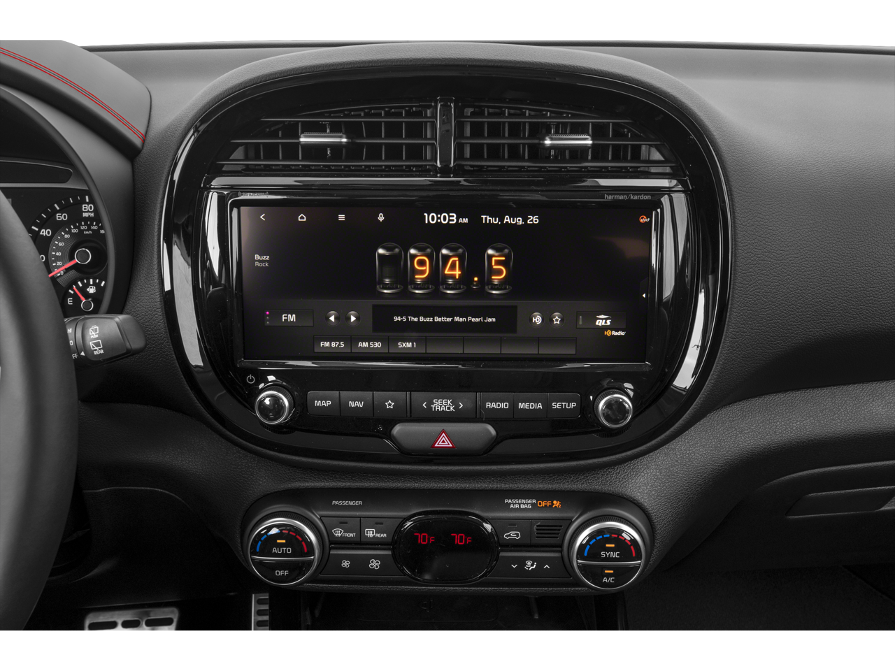 - Radio: AM/FM/MP3 Audio System -inc: UVO link, navigation, HD Radio, SiriusXM, 10.25" color touch screen, 6 speakers, support for Android Auto and Apple CarPlay, harman/kardon premium sound system w/center speaker, subwoofer and amplifier, USB input, audio remote control, Bluetooth® hands-free w/voice recognition and black shark fine type antenna